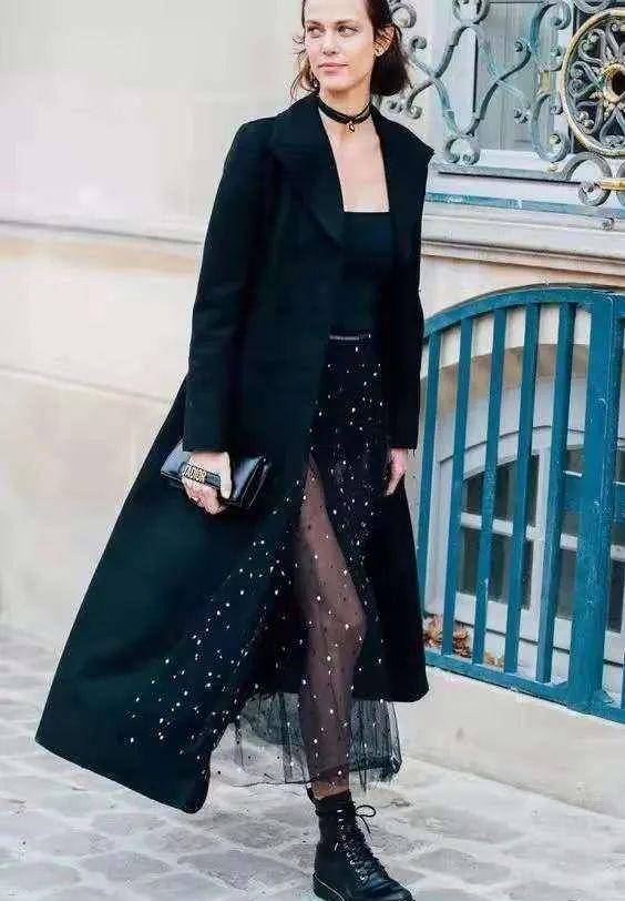 配色方面,可以选择全黑色的搭配,打造简约优雅的造型。比如,黑色的呢大衣,搭配黑色薄纱裙,既酷又美。黑色厚底短靴的加入,又平衡了黑色纱裙的女人味,为整个look增加几分酷感与帅气。▼