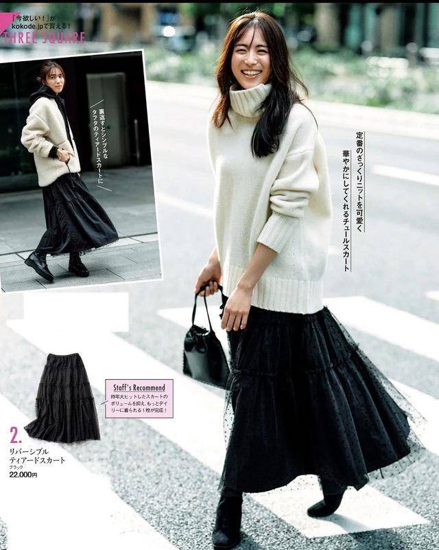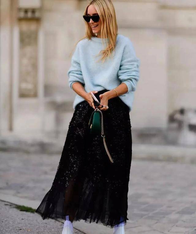 冬天穿毛衣也可以搭配黑色纱裙。无论什么颜色的毛衣,和黑裙子都超级般配。▼