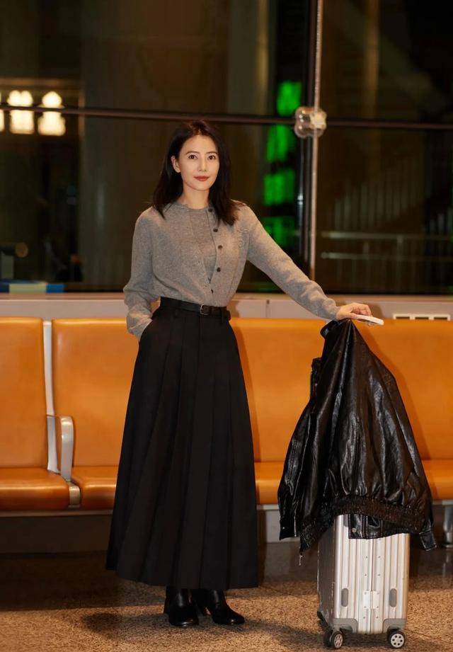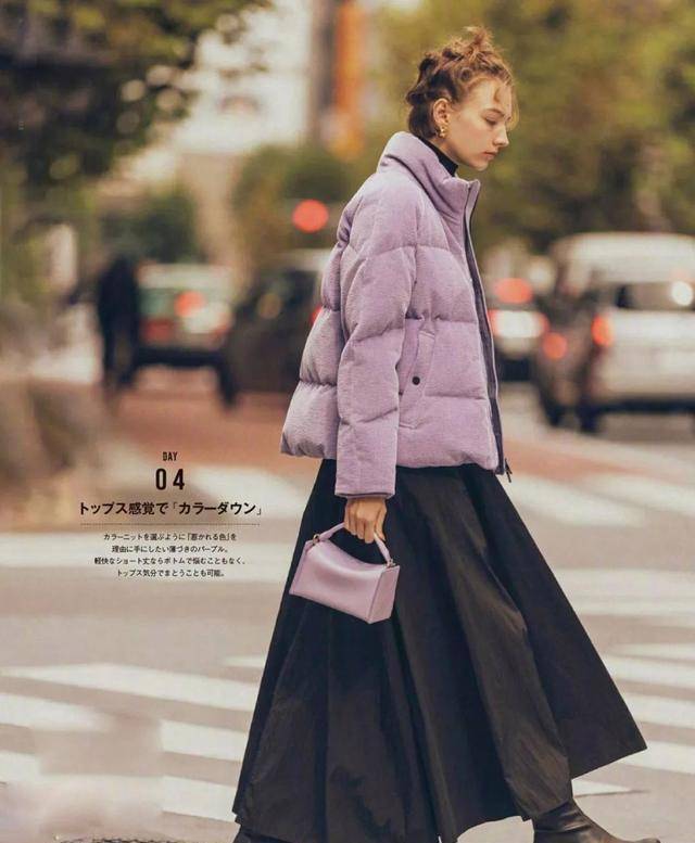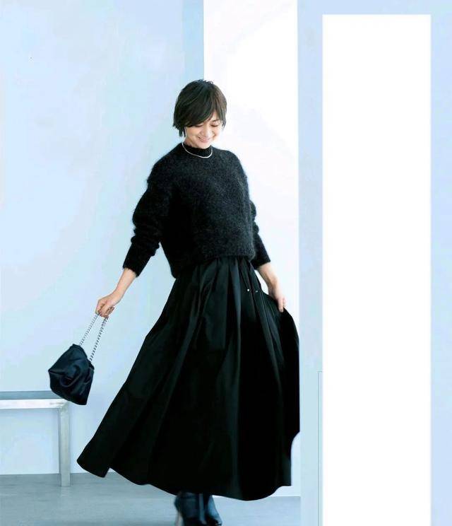 阔裙摆的黑色A字长裙,更飘逸一些,搭配黑色毛衣、浅紫色短羽绒外套都很好看。注意上衣要短一些,露出高腰线,整体比才好看。▼