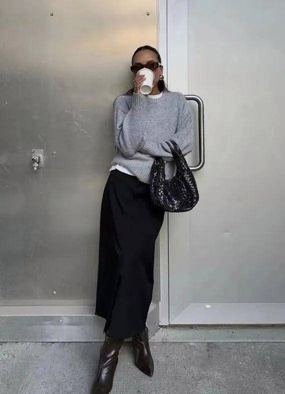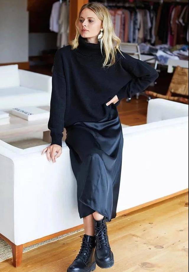 毛衣+黑色百褶裙+黑色靴子,冬日里优雅轻松又不失帅气。裙子最好选择垂感比较强的百褶裙,更显瘦。
