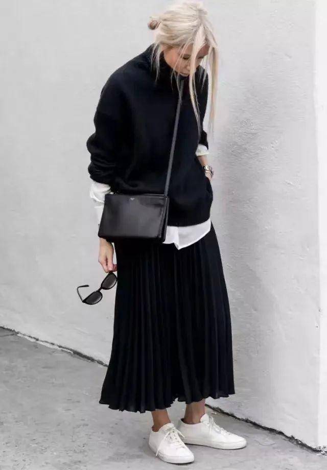 黑色高领毛衣和黑色百褶裙之间,用一件白色衬衫打底,衣袖和下摆露出一抹纯净的白,和小白鞋上下呼应,简约的黑白配色,整体造型时髦又清新。▼