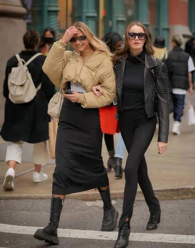 长款的黑色羽绒外套+黑色连衣裙,配上黑色短靴,时髦的全黑look,又暖又帅,气场十足。▼