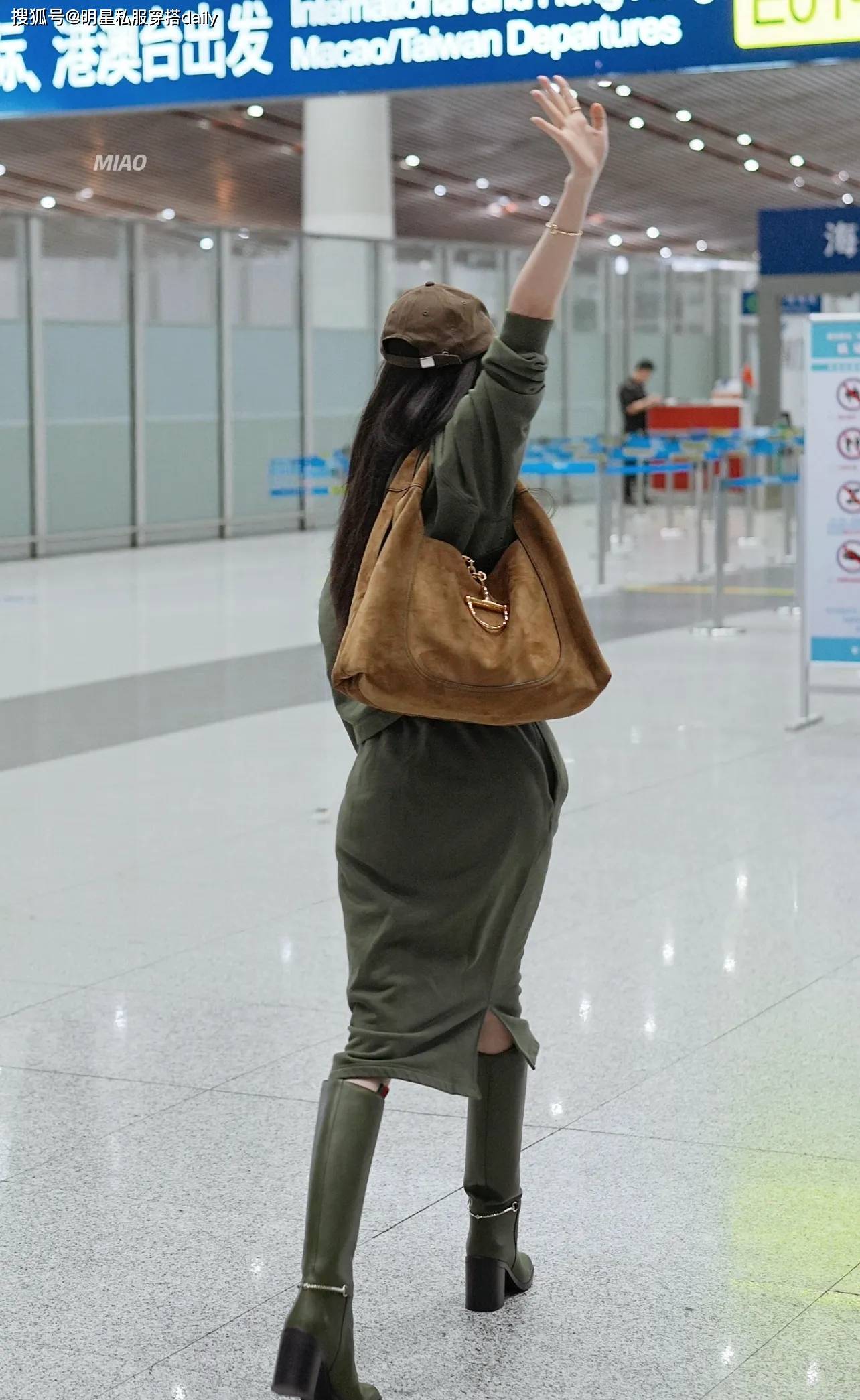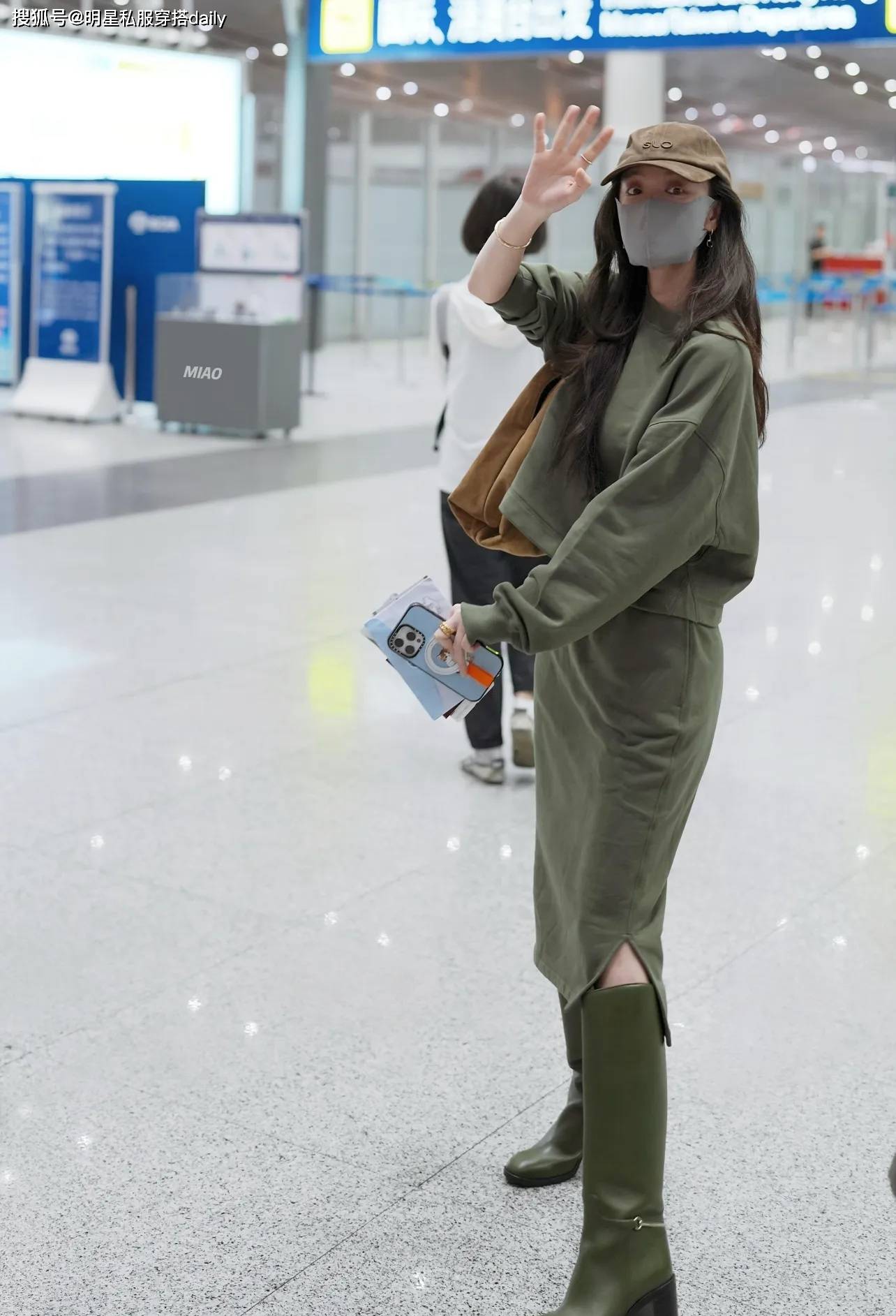 此次出发造型,倪妮选择同色系搭配打造视觉统一性,却在单品细节中暗藏巧思。上半身的卡其绿刺绣针织短卫衣,柔软面料中和了绿色的沉静,精致刺绣纹样为基础款注入设计感,短款剪裁更精准卡在腰线以上,瞬间优化身材比例;下半身搭配的同色系高腰侧开衩半身裙,高腰设计进一步拉长腿部线条,侧开衩细节则在行走间增添灵动,避免整体造型的沉闷。