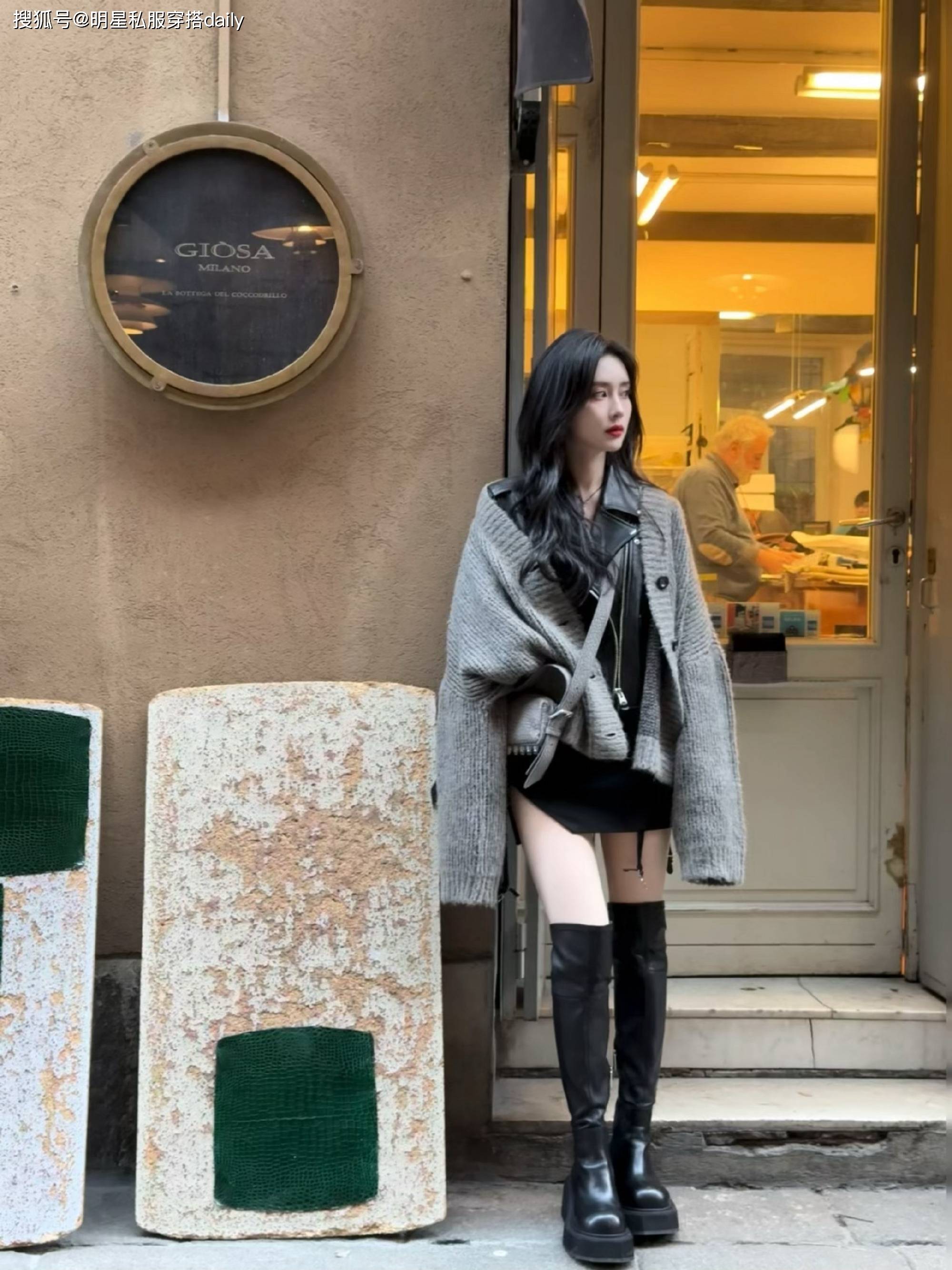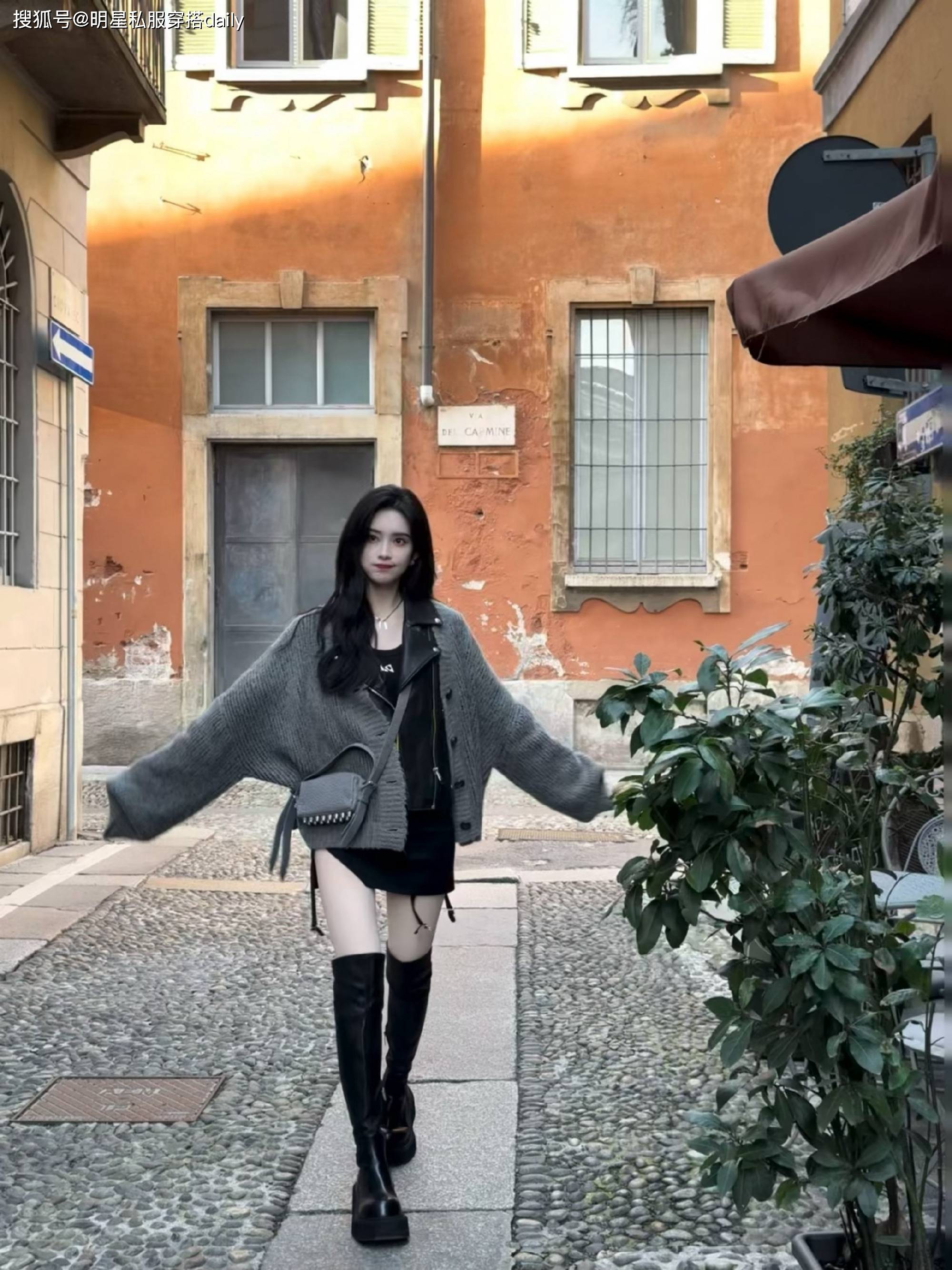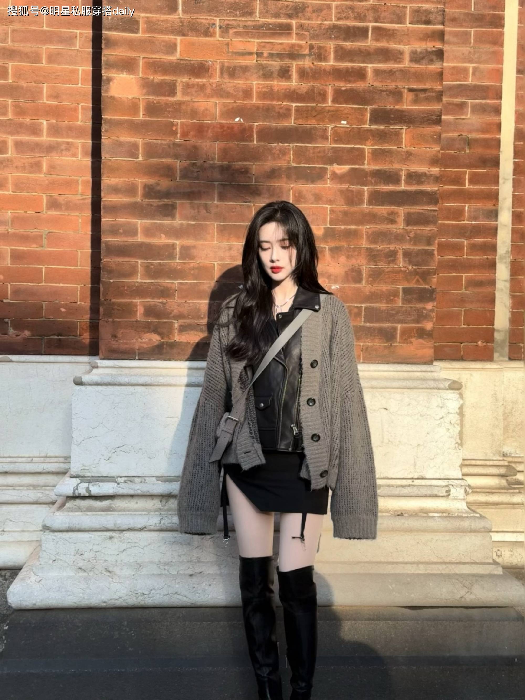 她最近广为热议的一套造型由棕色针织衫、皮衣以及长靴组成。整体感觉以冷静的黑灰基调为底,外搭一件黑色机车风皮衣,呈现出干练与叛逆并存的气场,内层则选用灰色针织开衫,给整身增添一丝柔和的温暖。内搭是一件黑色短款连衣裙,裙长在膝盖上方,与机车皮衣形成清晰的层次对比,突显她修长的腿部线条,并散发出一种随性不羁的时髦态度。下装则搭配黑色过膝的厚底靴,拉长腿部比例,整体轮廓更显挺拔。再加上她那一头柔美的长卷发,整套造型显得既有力量感又不失优雅与浪漫。